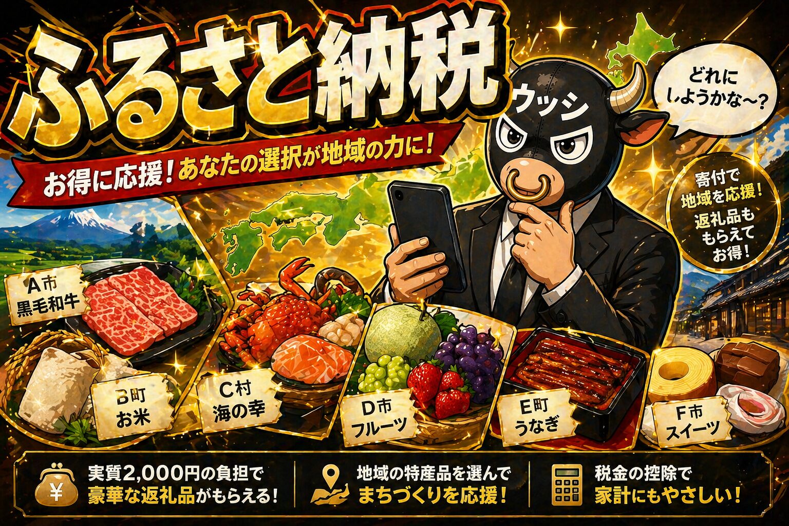 私ウッシのおすすめは、「普段は買わないけど家族が喜ぶ食材」を1〜2万円の寄付で選ぶ方法です。宮崎牛・神戸牛・ズワイガニ・うなぎ蒲焼きなどは、スーパーで買うと数千円以上しますが、ふるさと納税なら実質2,000円の負担の中に収まります。