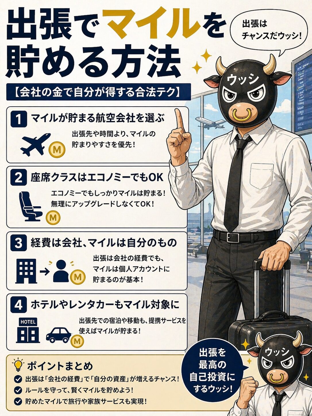 「面倒なイベントを得するチャンスに変える」——これがサラリーマン部長ウッシの流儀です。マイペースにいきましょう!出張も、積み重ねれば立派な資産形成の一部です。