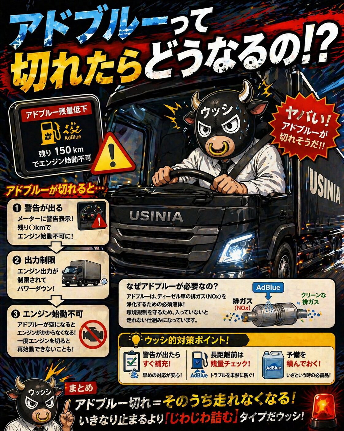 「アドブルーなんて関係ない」と思っていたけど、いざ1メモリになると焦りました。でも正しい知識があれば冷静に対処できます。知識は最高のお守りです。マイペースにいきましょう!🐮